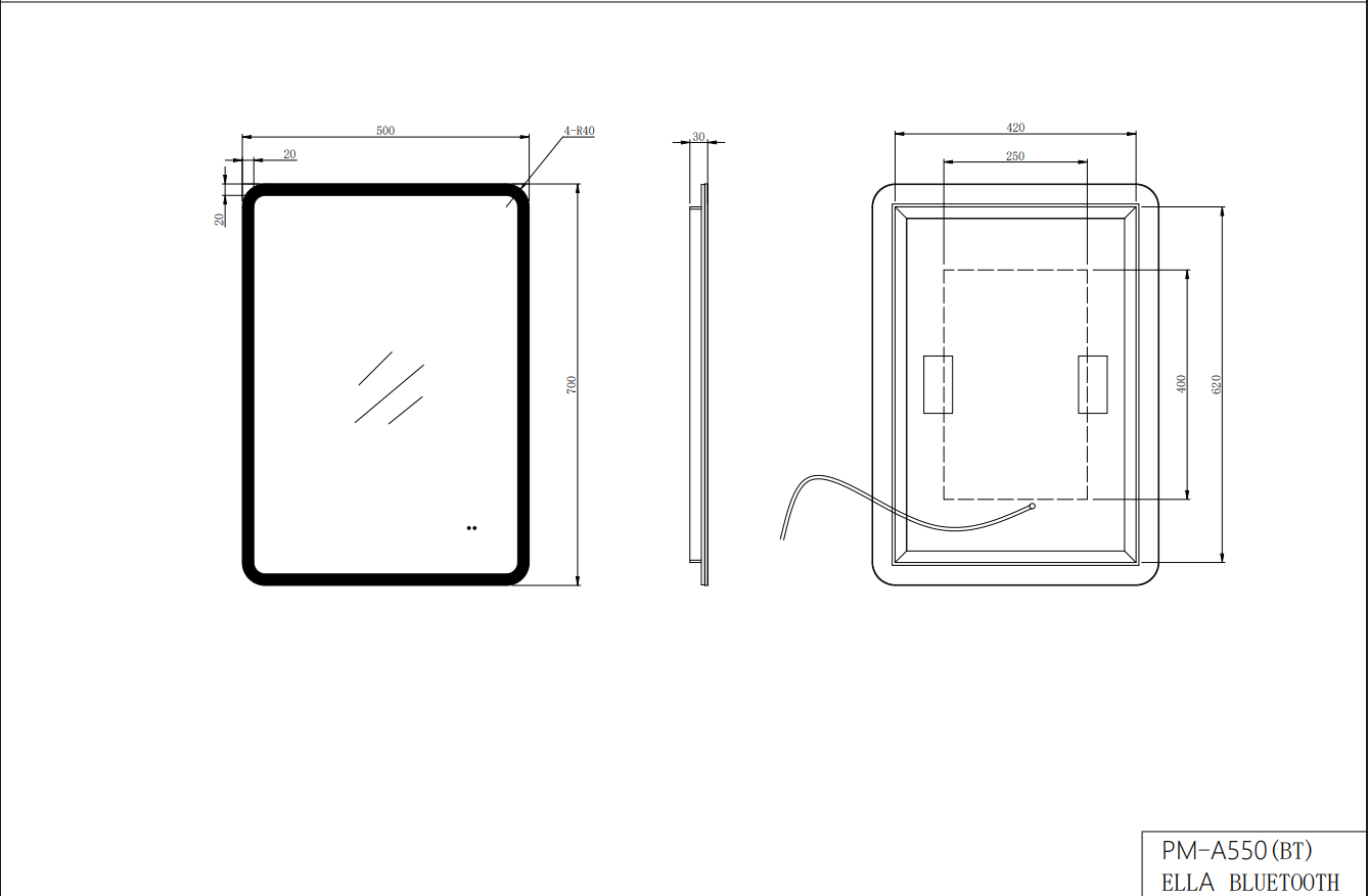 The ELLA LED Bluetooth Mirror (500×700mm) elevates everyday bathroom routines with smart technology, modern styling and premium illumination. Its rounded‑corner rectangular design delivers a clean, elegant look, while the diffused perimeter LED creates a soft, even halo of light that enhances visibility without harsh shadows.
