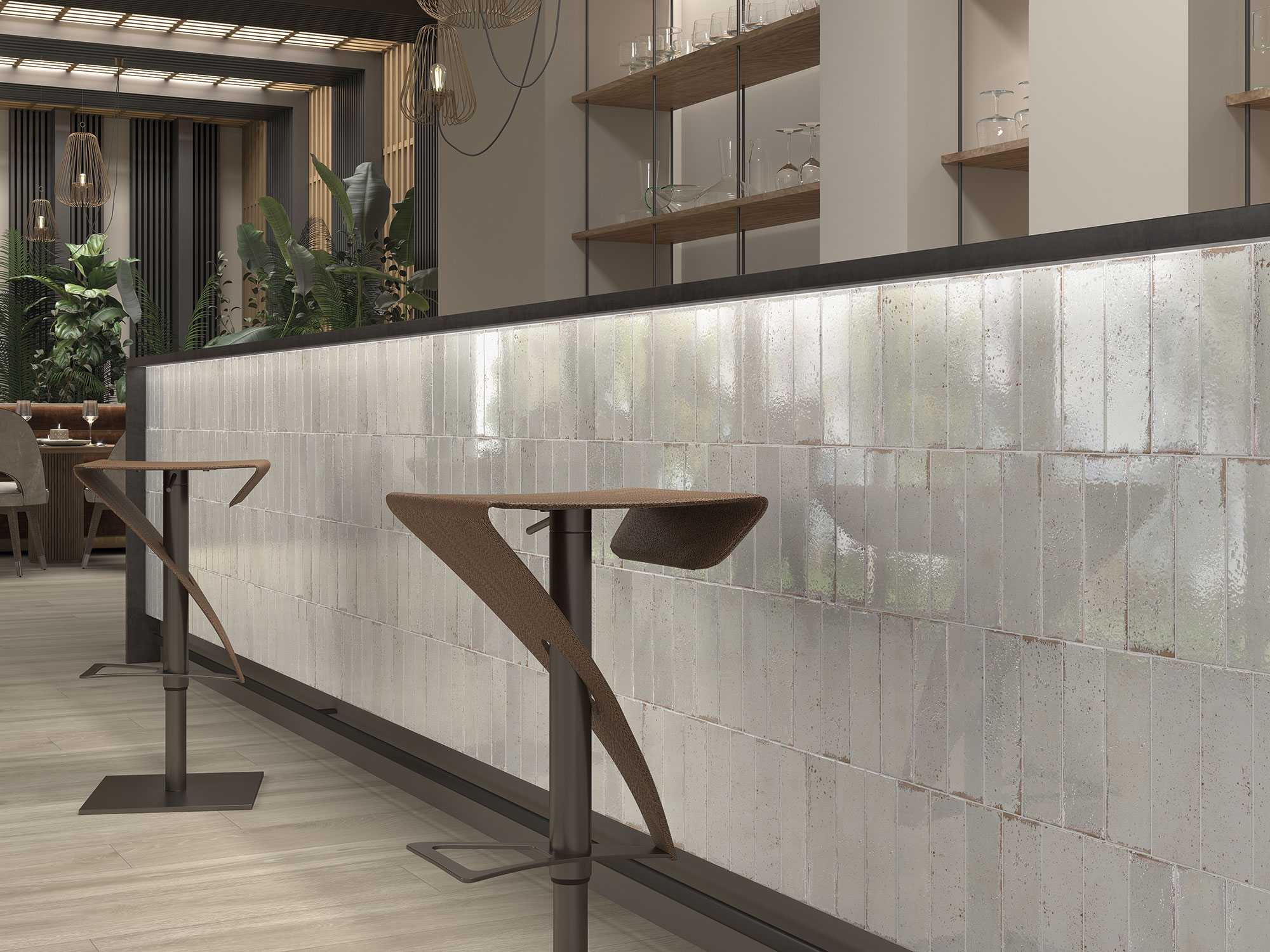 Each tile features a high‑gloss surface with a textured, intentionally uneven glaze. This creates gentle light reflections and a stunning handmade aesthetic. The distressed edges further enhance the rustic charm, adding character and individuality to every piece. Whether installed in a classic brick pattern, stacked layout or herringbone design, the Musa White tile produces a stylish, high‑impact visual result.